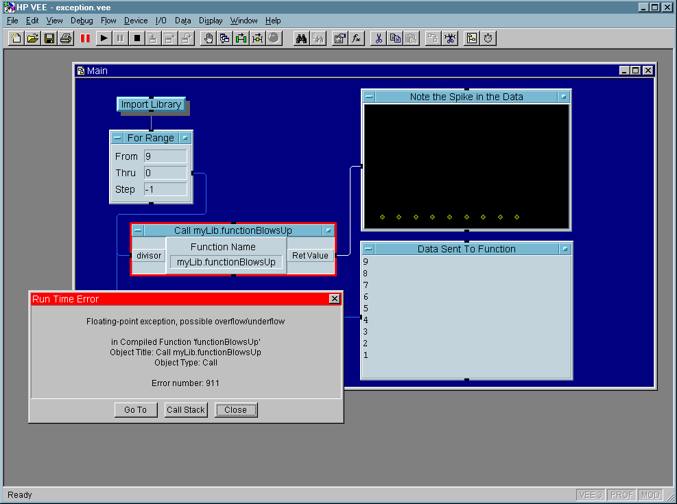 On occaision, we have been asked to demonstrate a way for people using DLL's with VEE to catch exceptions in the functions they write. Exceptions are a mechanism that allow a process to recover from errors that would normally terminate the process, allowing a process to continue execution. For instance, if a DLL performs a division operation on data you pass in from a VEE program, there is the potential that the function could produce a divide-by-zero error.