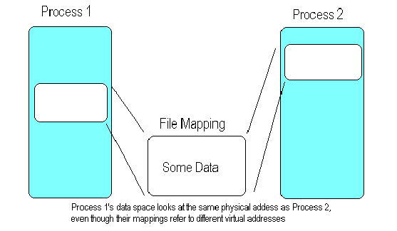 If there is no file attached to the mapped memory, the operating system never needs to commit any data changes to a disk file. This technique is how we achieve the memory sharing. One process, usually the data producer (in our case, an instrument control program) will create a memory-mapped file that doesn't reference a disk file. The data consumer program, in our case the analysis and display program, will open that mapped file. Because each program has a process-relative view of the virtual memory created when we created the mapped file, when they reference the data space that has been assigned to the mapped file, they are really referencing a piece of virtual memory common to both processes.