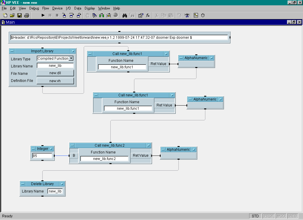 The "Delete Library" object instructs our example application to free the library whose name was assigned in the "Import Library"object. The operating system will unload "old.dll" from memory when it is no longer referenced, which will, in all probability, be when the HP VEE application exits.