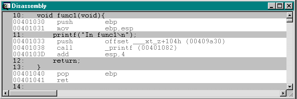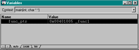 These two snippets are available as complete programs in fp.c and foo.c. It makes the preceding discussion much more concrete to compile the examples into debug executables and step through the resultant applications in a debugger. Let's take a look at an example run. Figure 1 is a screen shot of the debugger variables window taken while stepping through the application built from the source file "fp.c". Note that the value of "func_ptr" is 0x00401005. Figure 2 is a screen shot showing the split source and assembly window of the program, highlighting the contents of the address 0x00401005. This address contains an instruction to jump to program location 0x00401030. Figure 3 highlights the contents of the jump target. It is the location of the first instruction in the function "func1". So, our function pointer, "func_ptr", holds the address of an instruction that jumps directly to the function named "func1". If we were to set a break point on the jump instruction, we would see that we do indeed break there when we call through "func_ptr". Stepping from that point puts us in "func1".
