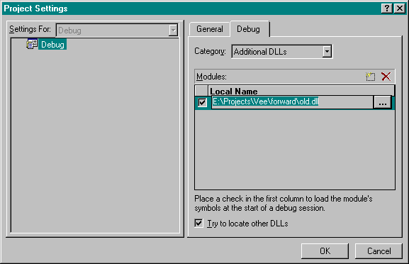 Like we did before, let's step through the lifetime of our application in the debugger. We will first attach the DLL to the address space of our debugger to enable us to set breakpoints in the DLL source (assuming that we have the source :-) ). Figure 4 is a screen shot of the Visual C++ project settings dialog that allows us to pre-attach a DLL to our address space. Figure 5 is a screen shot of the debugger configuration dialog that lets you specify which application you wish the debugger to execute when you start a debugging session. Incidentally, you can do this whether the application is built to be debuggable or not. It isn't even necessary to have the calling application source. This latter point is what makes it possible to debug custom DLL's written for use with HP VEE. We will show an example of this in a later section of this paper.