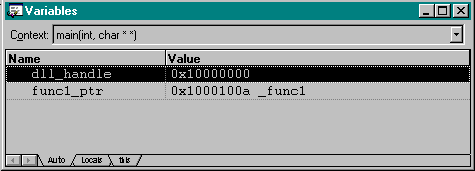 Figure 6 is a screen shot of the "load" application after it has attached the DLL and located its function. The value of the variable "dll_handle" is the application address at which our dynamically-attached DLL is located. Notice that the debugger tells us that the function address is 0x100A bytes beyond to the base address where the library itself was loaded.