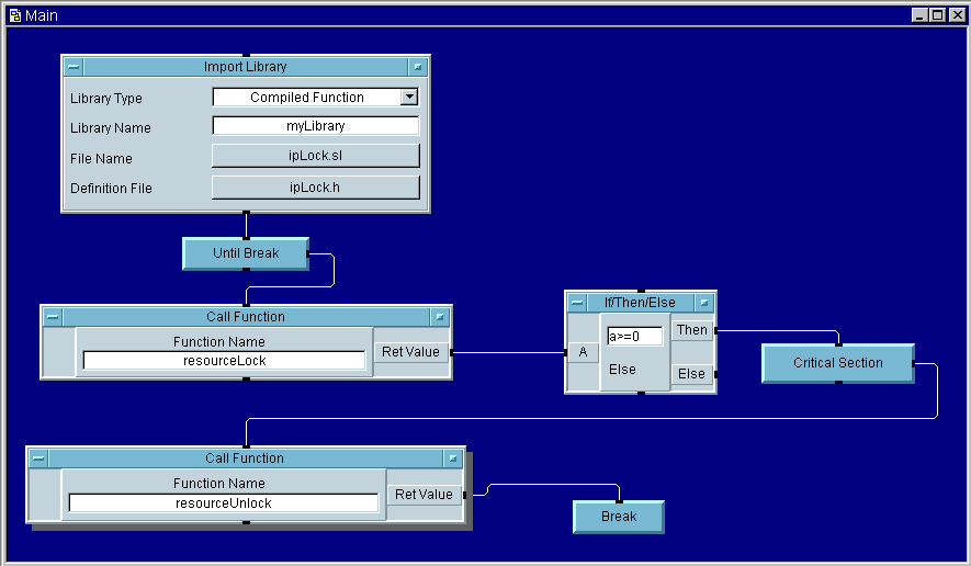 This is a set of VEE Compiled Functions which make use of counting semaphores to provide an inter-process synchronization mechanism. There are four Compiled functions, two of which are used to indicate that an entity has exclusive use of a shared resource, one that allows an entity to release its ownership of a resource, and one that destroys the locking mechanism. Because we use counting semaphores, it is necessary to balance the use of the locking and unlocking facilities. So, for every time an entity acquires a resource lock, that entity must follow by releasing the lock. In the case where an entity terminates before having had the opportunity to release a lock, it is possible to remove the locking mechanism entirely before a successive attempt to lock a resource.