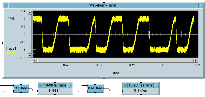 One common parameter for digital signals (pulses, square waves, etc.) is fall time. Fall time is the transition time from a lower extreme to an upper extreme. This is commonly defined as 10-90 time (time from 10% of the full transition to 90%) or 20-80 fall time. This function takes an arbitrary signal and analyzes it to determine the average fall time. The input margin is used to define both the upper and lower transition limits. Hence margin=10 is the same as 10-90 fall time.