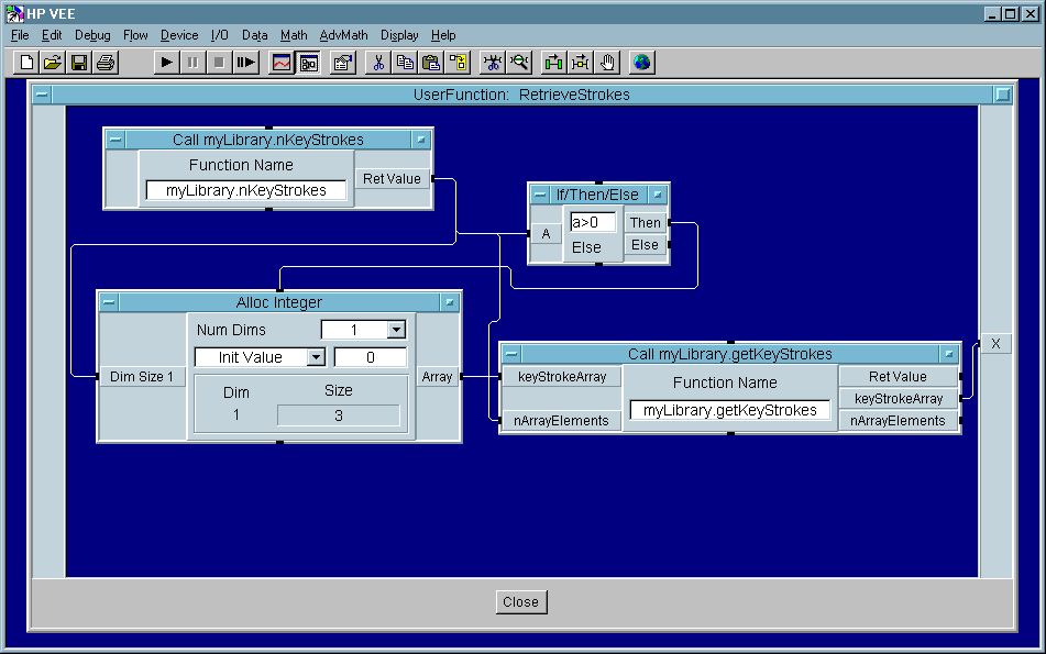 We make a call to the nKeyStrokes function whose result is used as the input to an Allocate Integer object, if the number of captured keystrokes is greater than 0. The number of captured keystrokes and the newly-created array are the arguments passed to the getKeyStrokes function. The resultant array then propagates from the User Function's sole data out pin.