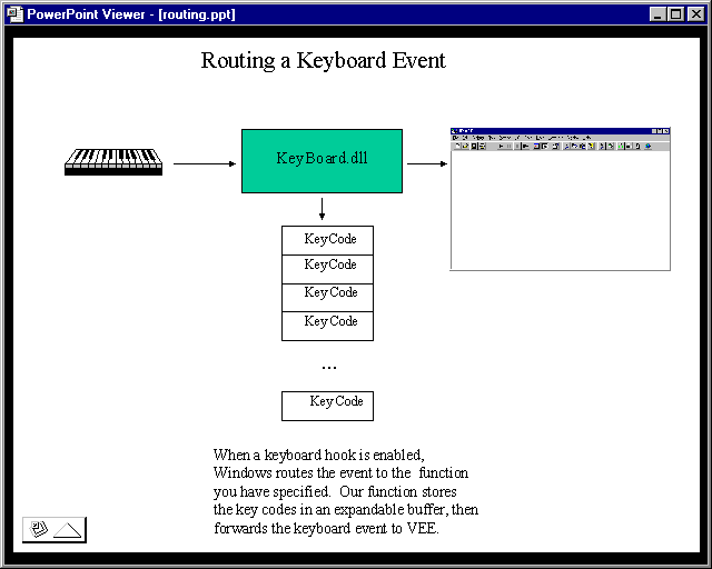 Your VEE program will import a the DLL called 'KeyBoard.dll.' This DLL has functions to enable and disable key stroke event logging. After enabling key stroke logging, every time you hit a key while VEE is the active window, the Windows system will invoke a callback function in the DLL. That callback function will add the new key code to a list. When the VEE program wishes to retrieve any recorded key codes, It calls another function in the DLL. This latter function will copy some number of key codes into a buffer the VEE program provides, then remove those key codes from the DLL's list. You may read any number of stored key codes from zero to the number of entries in the key code list.