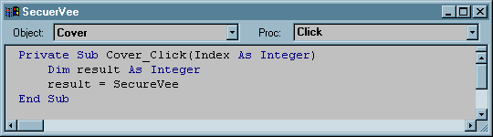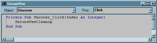 We added two command buttons to the form to illustrate calling the functions in our DLL. The button labeled Cover calls the SecureVee function when pressed, while the button labeled Uncover calls the SecureVeeCleanup function. Figure 5 contains the listings showing the click callback functions for each of the two command buttons.