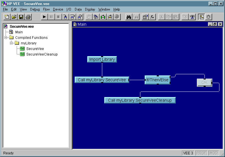 The program first loads the SecureVee dll using the Import Library object. Next it calls the SecureVee function, taking over the desktop. If the call to the SecureVee function is successful, as indicated by the use of the If/Then/Else object, then the program enables an OK button. The program will pause on the OK button until you click it with the mose. Once the OK button runs, the program calls the SecureVeeCleanup function, which restores the application to the state it was in before you took control of the desktop.