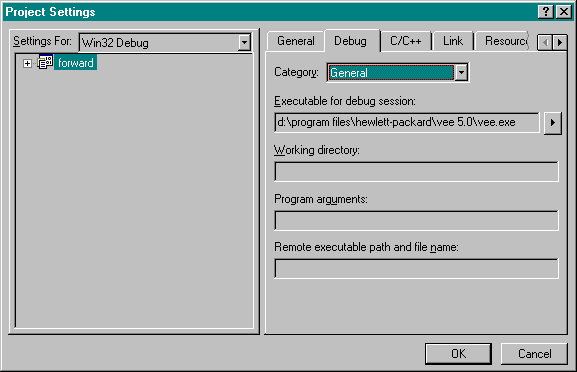 Like we did before, let's step through the lifetime of our application in the debugger. We will first attach the DLL to the address space of our debugger to enable us to set breakpoints in the DLL source (assuming that we have the source :-) ). Figure 4 is a screen shot of the Visual C++ project settings dialog that allows us to pre-attach a DLL to our address space. Figure 5 is a screen shot of the debugger configuration dialog that lets you specify which application you wish the debugger to execute when you start a debugging session. Incidentally, you can do this whether the application is built to be debuggable or not. It isn't even necessary to have the calling application source. This latter point is what makes it possible to debug custom DLL's written for use with HP VEE. We will show an example of this in a later section of this paper.
