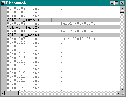 These two snippets are available as complete programs in fp.c and foo.c. It makes the preceding discussion much more concrete to compile the examples into debug executables and step through the resultant applications in a debugger. Let's take a look at an example run. Figure 1 is a screen shot of the debugger variables window taken while stepping through the application built from the source file "fp.c". Note that the value of "func_ptr" is 0x00401005. Figure 2 is a screen shot showing the split source and assembly window of the program, highlighting the contents of the address 0x00401005. This address contains an instruction to jump to program location 0x00401030. Figure 3 highlights the contents of the jump target. It is the location of the first instruction in the function "func1". So, our function pointer, "func_ptr", holds the address of an instruction that jumps directly to the function named "func1". If we were to set a break point on the jump instruction, we would see that we do indeed break there when we call through "func_ptr". Stepping from that point puts us in "func1".